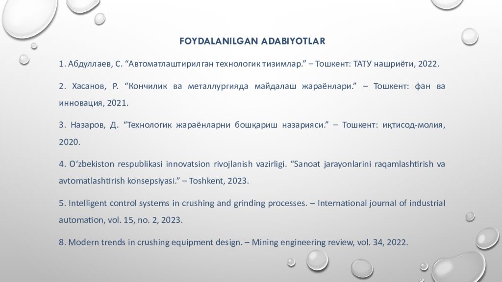 Foydalanilgan adabiyotlar 1. Абдуллаев, С. “ Автоматлаштирилган технологик тизимлар.” – Тошкент : ТАТУ нашриёти, 2022. 2. Хасанов, Р. “ Кончилик ва металлургияда майдалаш жараёнлари.” – Тошкент : фан ва инновация, 2021. 3. Назаров, Д. “ Технологик жараёнларни бошқариш назарияси.” – Тошкент : иқтисод-молия, 2020. 4. O‘zbekiston respublikasi innovatsion rivojlanish vazirligi. “ Sanoat jarayonlarini raqamlashtirish va avtomatlashtirish konsepsiyasi.” – Toshkent, 2023. 5. Intelligent control systems in crushing and grinding processes. – International journal of industrial automation, vol. 15, no. 2, 2023. 8. Modern trends in crushing equipment design. – Mining engineering review, vol. 34, 2022.