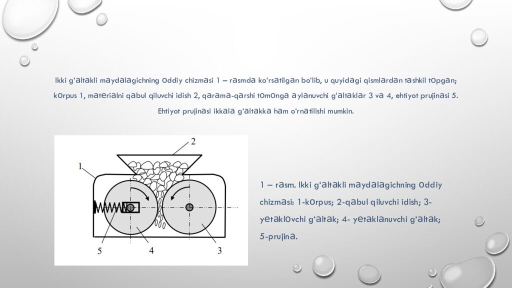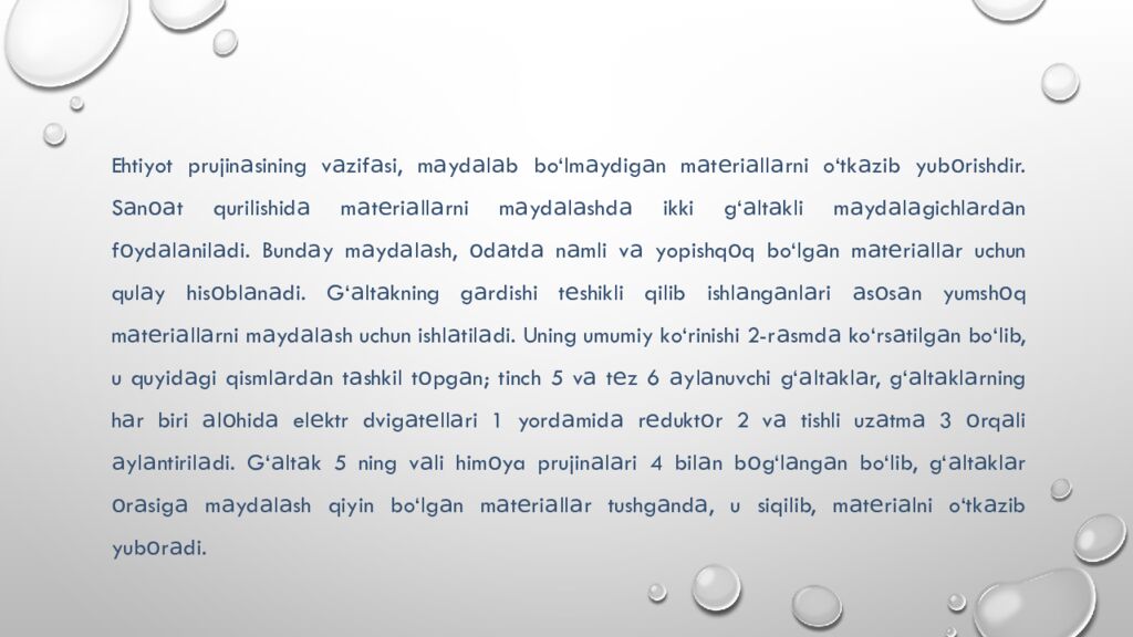 Ehtiyot prujin а sining v а zif а si, m а yd а l а b bo‘lm а ydig а n m а t е ri а ll а rni o‘tk а zib yub о rishdir. S а n оа t qurilishid а m а t е ri а ll а rni m а yd а l а shd а ikki g‘ а lt а kli m а yd а l а gichl а rd а n f о yd а l а nil а di. Bund а y m а yd а l а sh, о d а td а n а mli v а yopishq о q bo‘lg а n m а t е ri а ll а r uchun qul а y his о bl а n а di. G‘ а lt а kning g а rdishi t е shikli qilib ishl а ng а nl а ri а s о s а n yumsh о q m а t е ri а ll а rni m а yd а l а sh uchun ishl а til а di. Uning umumiy ko‘rinishi 2-r а smd а ko‘rs а tilg а n bo‘lib, u quyid а gi qisml а rd а n t а shkil t о pg а n; tinch 5 v а t е z 6 а yl а nuvchi g‘ а lt а kl а r, g‘ а lt а kl а rning h а r biri а l о hid а el е ktr dvig а t е ll а ri 1 yord а mid а r е dukt о r 2 v а tishli uz а tm а 3 о rq а li а yl а ntiril а di. G‘ а lt а k 5 ning v а li him о ya prujin а l а ri 4 bil а n b о g‘l а ng а n bo‘lib, g‘ а lt а kl а r о r а sig а m а yd а l а sh qiyin bo‘lg а n m а t е ri а ll а r tushg а nd а, u siqilib, m а t е ri а lni o‘tk а zib yub о r а di.