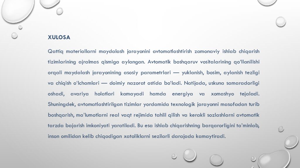 Xulosa Qattiq materiallarni maydalash jarayonini avtomatlashtirish zamonaviy ishlab chiqarish tizimlarining ajralmas qismiga aylangan. Avtomatik boshqaruv vositalarining qo‘llanilishi orqali maydalash jarayonining asosiy parametrlari — yuklanish, bosim, aylanish tezligi va chiqish o‘lchamlari — doimiy nazorat ostida bo‘ladi. Natijada, uskuna samaradorligi oshadi, avariya holatlari kamayadi hamda energiya va xomashyo tejaladi. Shuningdek, avtomatlashtirilgan tizimlar yordamida texnologik jarayonni masofadan turib boshqarish, ma’lumotlarni real vaqt rejimida tahlil qilish va kerakli sozlashlarni avtomatik tarzda bajarish imkoniyati yaratiladi. Bu esa ishlab chiqarishning barqarorligini ta’minlab, inson omilidan kelib chiqadigan xatoliklarni sezilarli darajada kamaytiradi.