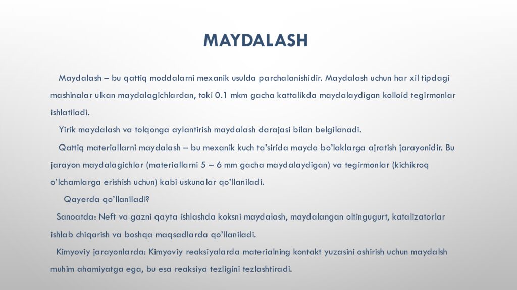 Maydalash – bu qattiq moddalarni mexanik usulda parchalanishidir. Maydalash uchun har xil tipdagi mashinalar ulkan maydalagichlardan, toki 0.1 mkm gacha kattalikda maydalaydigan kolloid tegirmonlar ishlatiladi. Yirik maydalash va tolqonga aylantirish maydalash darajasi bilan belgilanadi. Qattiq materiallarni maydalash – bu mexanik kuch ta’sirida mayda bo’laklarga ajratish jarayonidir. Bu jarayon maydalagichlar ( materiallarni 5 – 6 mm gacha maydalaydigan ) va tegirmonlar ( kichikroq o’lchamlarga erishish uchun ) kabi uskunalar qo’llaniladi. Qayerda qo’llaniladi ? Sanoatda : Neft va gazni qayta ishlashda koksni maydalash, maydalangan oltingugurt, katalizatorlar ishlab chiqarish va boshqa maqsadlarda qo’llaniladi. Kimyoviy jarayonlarda : Kimyoviy reaksiyalarda materialning kontakt yuzasini oshirish uchun maydalsh muhim ahamiyatga ega, bu esa reaksiya tezligini tezlashtiradi.