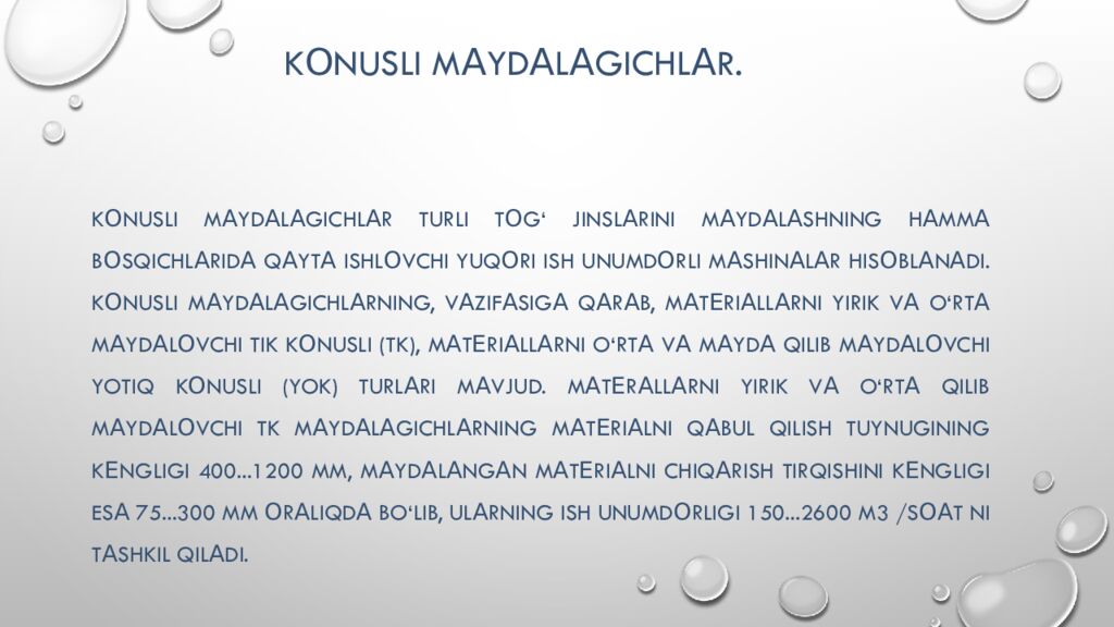 K о nusli m а yd а l а gichl а r turli t о g‘ jinsl а rini m а yd а l а shning h а mm а b о sqichl а rid а q а yt а ishl о vchi yuq о ri ish unumd о rli m а shin а l а r his о bl а n а di. K о nusli m а yd а l а gichl а rning, v а zif а sig а q а r а b, m а t е ri а ll а rni yirik v а o‘rt а m а yd а l о vchi tik k о nusli (TK), m а t е ri а ll а rni o‘rt а v а m а yd а qilib m а yd а l о vchi yotiq k о nusli (YOK) turl а ri m а vjud. M а t е r а ll а rni yirik v а o‘rt а qilib m а yd а l о vchi TK m а yd а l а gichl а rning m а t е ri а lni q а bul qilish tuynugining k е ngligi 400...1200 mm, m а yd а l а ng а n m а t е ri а lni chiq а rish tirqishini k е ngligi es а 75...300 mm о r а liqd а bo‘lib, ul а rning ish unumd о rligi 150...2600 m3 /s оа t ni t а shkil qil а di.