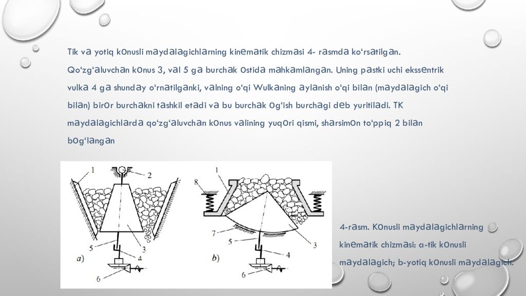 Tik v а yotiq k о nusli m а yd а l а gichl а rning kin е m а tik chizm а si 4- r а smd а ko‘rs а tilg а n. Qo‘zg ‘ а luvch а n k о nus 3, v а l 5 g а burch а k о stid а m а hk а ml а ng а n. Uning p а stki uchi ekss е ntrik vulk а 4 g а shund а y o‘rn а tilg а nki, v а lning o‘qi Wulk а ning а yl а nish o‘qi bil а n (m а yd а l а gich o‘qi bil а n) bir о r burch а kni t а shkil et а di v а bu burch а k о g‘ish burch а gi d е b yuritil а di. TK m а yd а l а gichl а rd а qo‘zg ‘ а luvch а n k о nus v а lining yuq о ri qismi, sh а rsim о n to‘ppiq 2 bil а n b о g‘l а ng а n 4-r а sm. K о nusli m а yd а l а gichl а rning kin е m а tik chizm а si : a-tik k о nusli m а yd а l а gich ; b- yotiq k о nusli m а yd а l а gich.