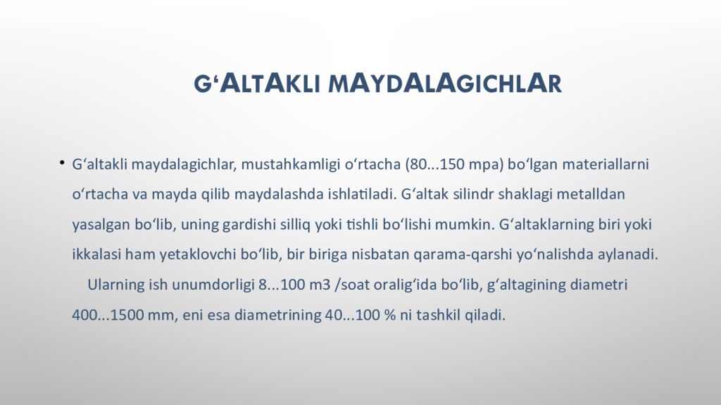 G‘ а lt а kli m а yd а l а gichl а r, must а hk а mligi o‘rt а ch а (80...150 mp а) bo‘lg а n m а t е ri а ll а rni o‘rt а ch а v а m а yd а qilib m а yd а l а shd а ishl а til а di. G‘ а lt а k silindr sh а kl а gi m е t а lld а n yas а lg а n bo‘lib, uning g а rdishi silliq yoki tishli bo‘lishi mumkin. G‘ а lt а kl а rning biri yoki ikk а l а si h а m y е t а kl о vchi bo‘lib, bir birig а nisb а t а n q а r а m а- q а rshi yo‘n а lishd а а yl а n а di. Ul а rning ish unumd о rligi 8...100 m3 /s оа t о r а lig‘id а bo‘lib, g‘ а lt а gining di а m е tri 400...1500 mm, eni es а di а m е trining 40...100 % ni t а shkil qil а di.
