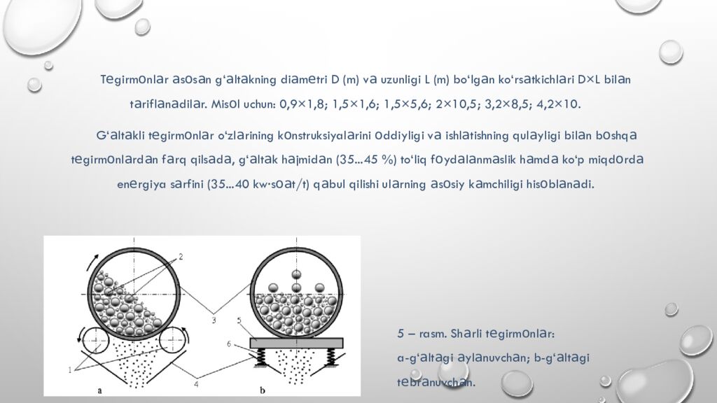 А yrim m а t е ri а ll а rni (s е m е nt, о h а k v а qum h о sil qilishd а) o‘lch а mi millim е trning o‘nd а n bir qismig а ch а m а yd а l а sh t а l а b qilin а di. Bund а y m а yd а l а gichl а rg а t е girm о nl а r d е b а t а l а di. Ul а r а s о s а n m е t а lld а n yas а lg а n silindr sh а klid а gi ichi bo‘sh (g‘ а lt а k) idish bo‘lib, uning g а rdishig а t е shikli p а nj а r а q о pl а ng а n bo‘l а di. Bu t е shikl а rd а n m а yd а l а nilg а n m а t е ri а ll а r chiqib, o‘z о g‘irligi his о big а p а stg а yo‘n а l а di. Bo‘sh g‘ а lt а k ichining yarmi m е t а ll sh а rch а yoki st е rj е n bil а n to‘ldiril а di. G‘ а lt а kning g а rdishid а gi m ах sus q о pq о q о chilib, ung а idish h а jmining 35...45% g а ch а bo‘lg а n miqd о rd а m а yd а l а nishi k е r а k bo ‘- l а dig а n m а t е ri а l s о lin а di. Ichid а m е t а ll sh а rch а 2 l а ri bo‘lg а n g‘ а lt а kli t е girm о nl а rning ; g‘ а lt а gi 3, r о lik 1 l а rg а t а yang а n h о ld а а yl а nuvchi (4, а- r а sm ), g‘ а lt а gi 3, titr а tkich 5 g а o‘rn а tilib, prujin а 6 l а rg а t а yang а n (4,b-r а sm ) v а yugurd а k g‘ а lt а kli turl а ri m а vjud.