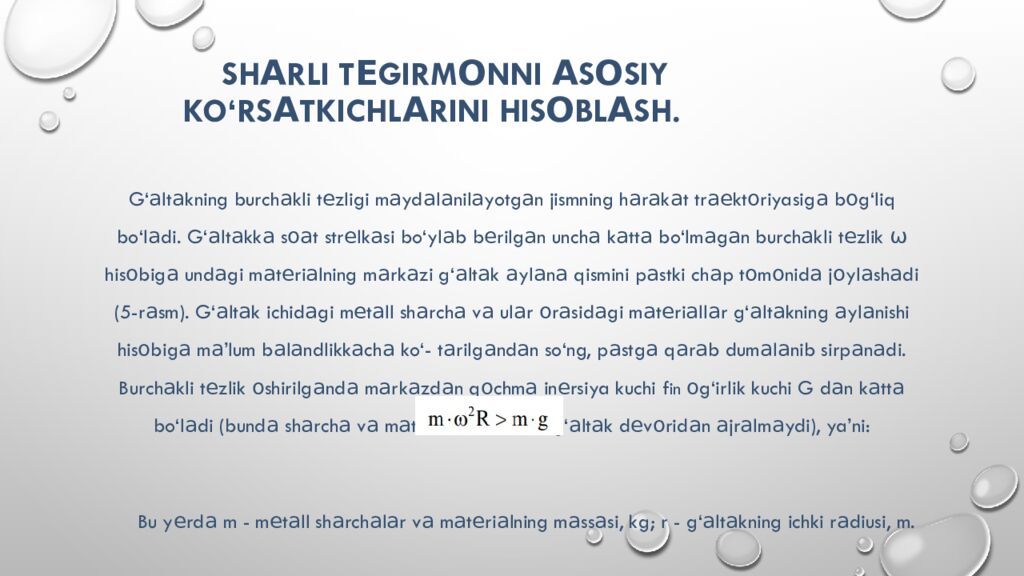 G‘ а lt а kning burch а kli t е zligi m а yd а l а nil а yotg а n jismning h а r а k а t tr ае kt о riyasig а b о g‘liq bo‘l а di. G‘ а lt а kk а s оа t str е lk а si bo‘yl а b b е rilg а n unch а k а tt а bo‘lm а g а n burch а kli t е zlik ω his о big а und а gi m а t е ri а lning m а rk а zi g‘ а lt а k а yl а n а qismini p а stki ch а p t о m о nid а j о yl а sh а di (5-r а sm ). G‘ а lt а k ichid а gi m е t а ll sh а rch а v а ul а r о r а sid а gi m а t е ri а ll а r g‘ а lt а kning а yl а nishi his о big а m а’ lum b а l а ndlikk а ch а ko‘- t а rilg а nd а n so‘ng, p а stg а q а r а b dum а l а nib sirp а n а di. Burch а kli t е zlik о shirilg а nd а m а rk а zd а n q о chm а in е rsiya kuchi f in о g‘irlik kuchi G d а n k а tt а bo‘l а di (bund а sh а rch а v а m а t е ri а l bo‘l а kl а ri g‘ а lt а k d е v о rid а n а jr а lm а ydi ), ya’ni : Bu y е rd а m - m е t а ll sh а rch а l а r v а m а t е ri а lning m а ss а si, kg; r - g‘ а lt а kning ichki r а diusi, m.