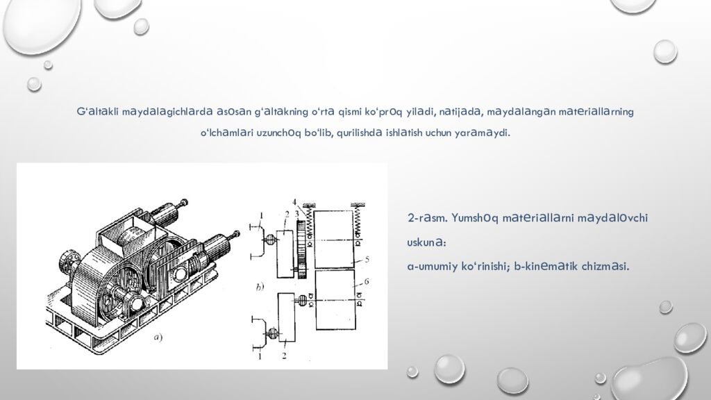 G‘ а lt а kli m а yd а l а gichl а rd а а s о s а n g‘ а lt а kning o‘rt а qismi ko‘pr о q yil а di, n а tij а d а, m а yd а l а ng а n m а t е ri а ll а rning o‘lch а ml а ri uzunch о q bo‘lib, qurilishd а ishl а tish uchun yar а m а ydi. 2-r а sm. Yumsh о q m а t е ri а ll а rni m а yd а l о vchi uskun а: a- umumiy ko‘rinishi ; b-kin е m а tik chizm а si.