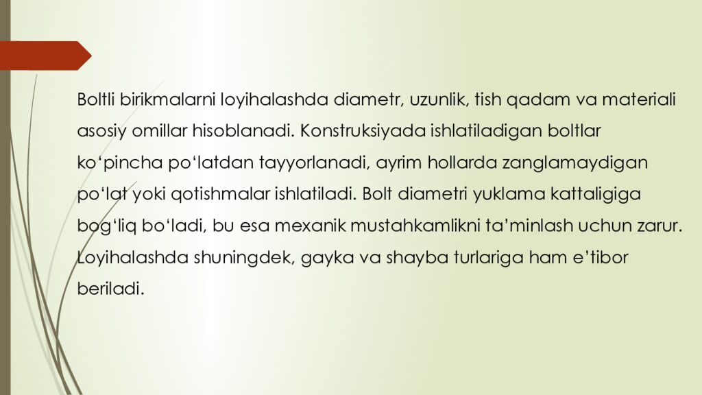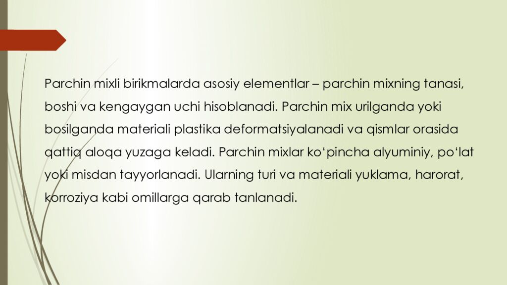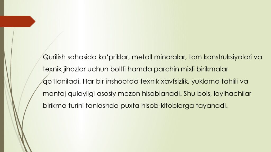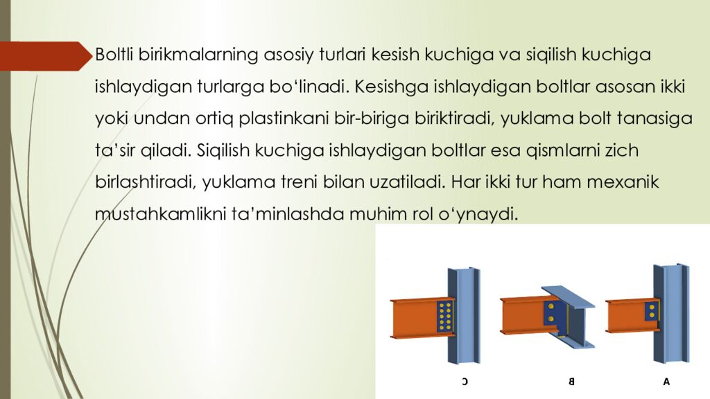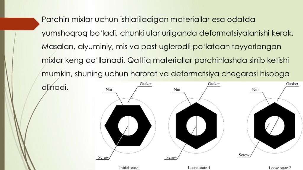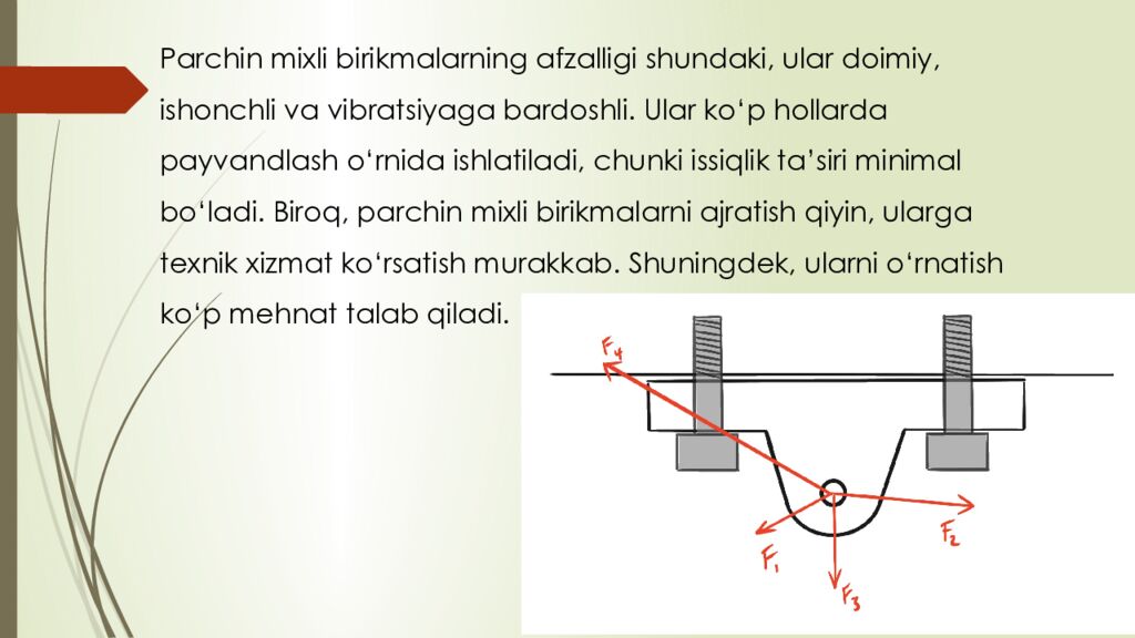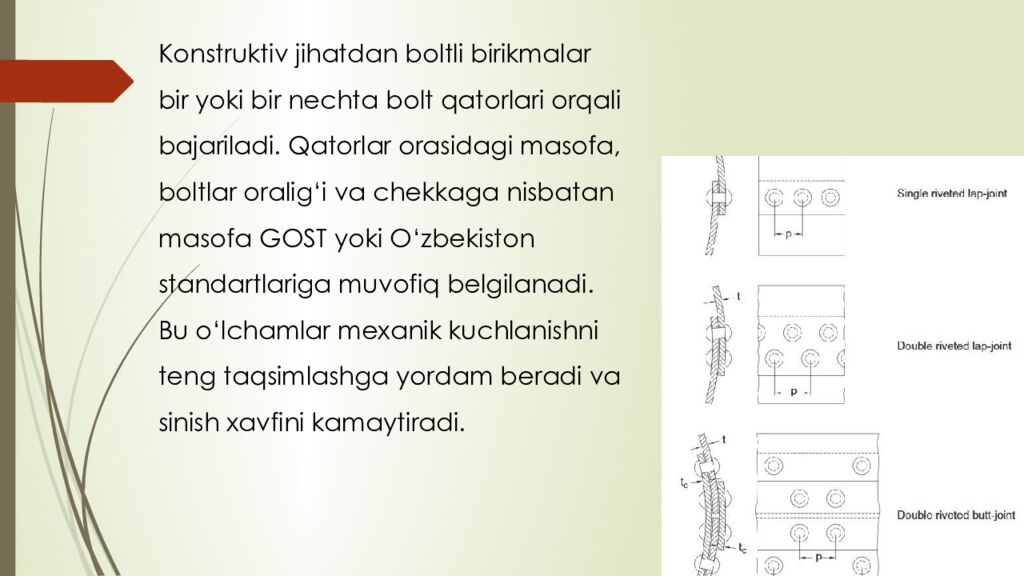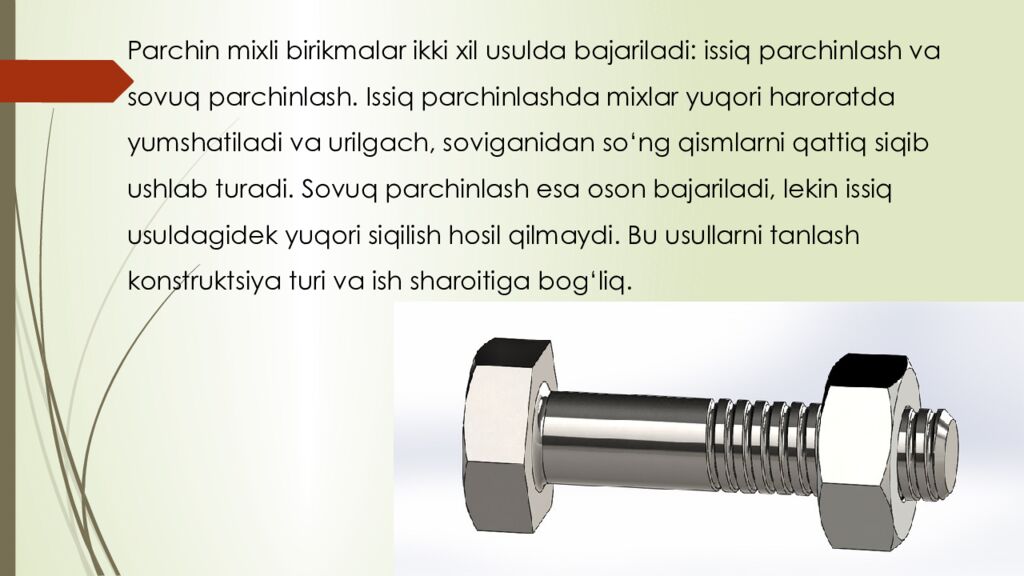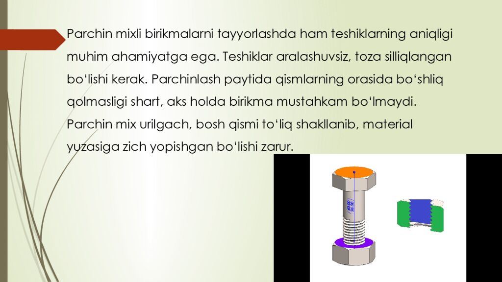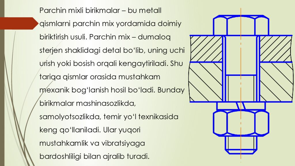 reja : 1. Boltli birikmalar haqida umumiy tushuncha 2. Parchin mixli birikmalar tuzilishi va qo‘llanilishi 3. Boltli va parchin mixli birikmalarning afzalliklari va kamchiliklari