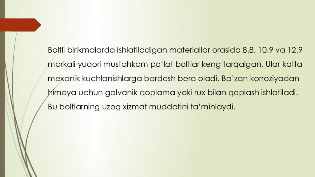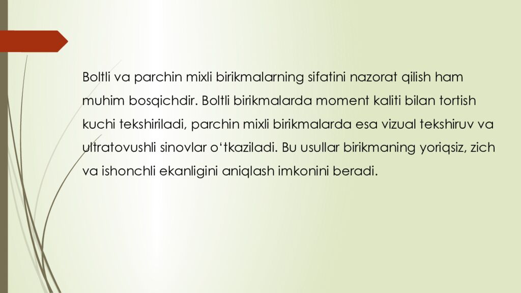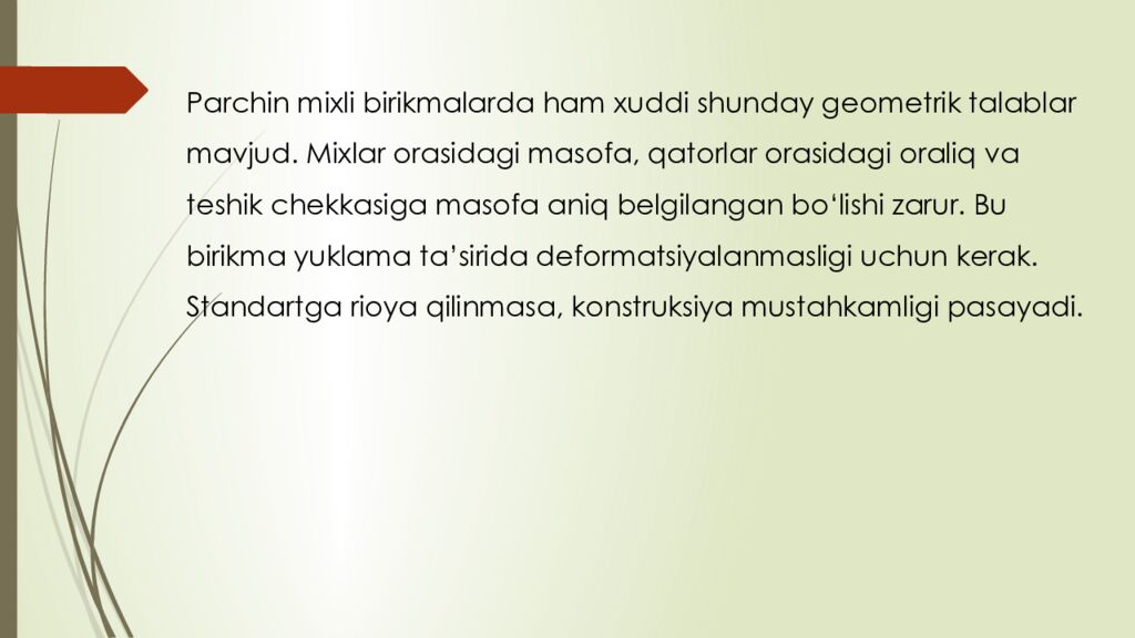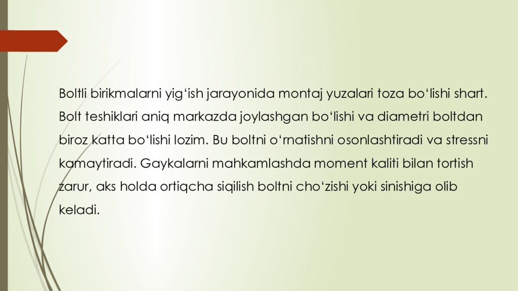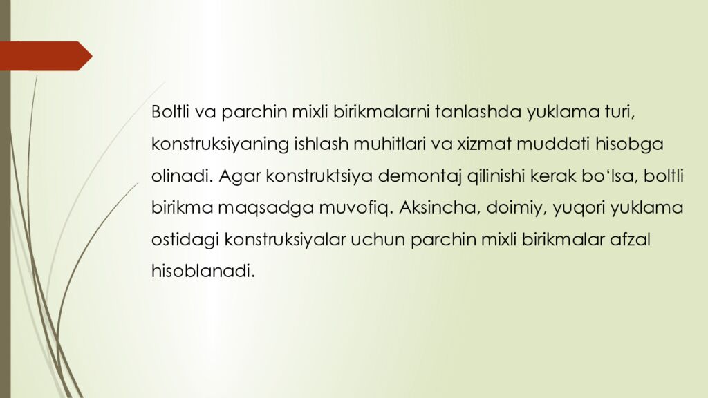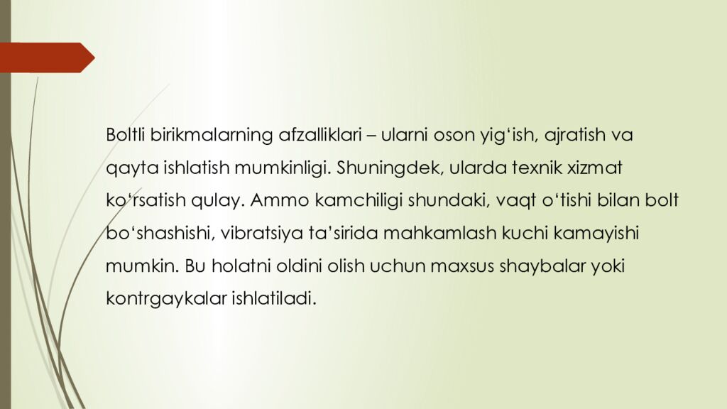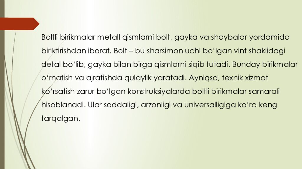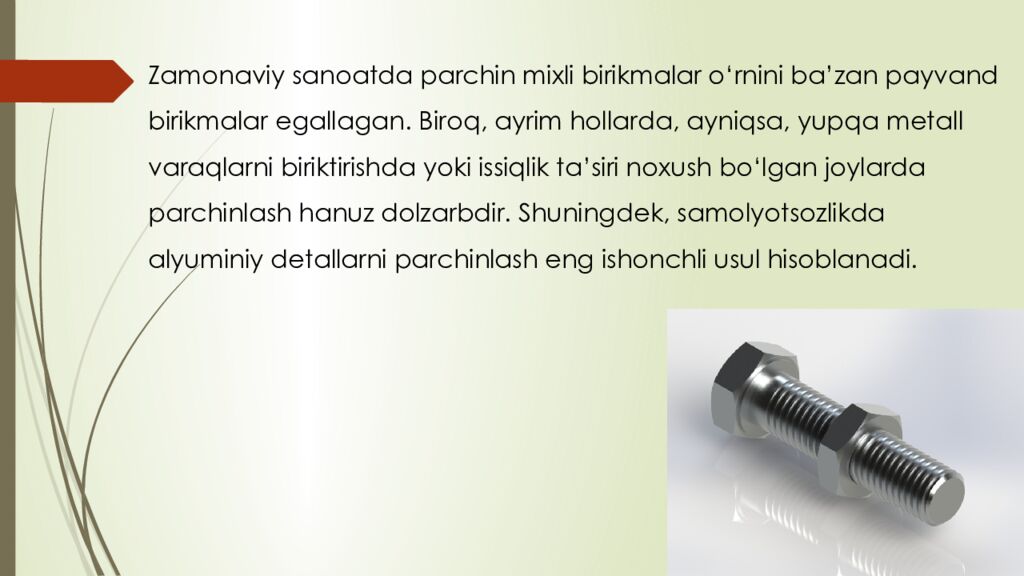 Последний слайд презентации: reja : 1. Boltli birikmalar haqida umumiy tushuncha 2. Parchin mixli birikmalar