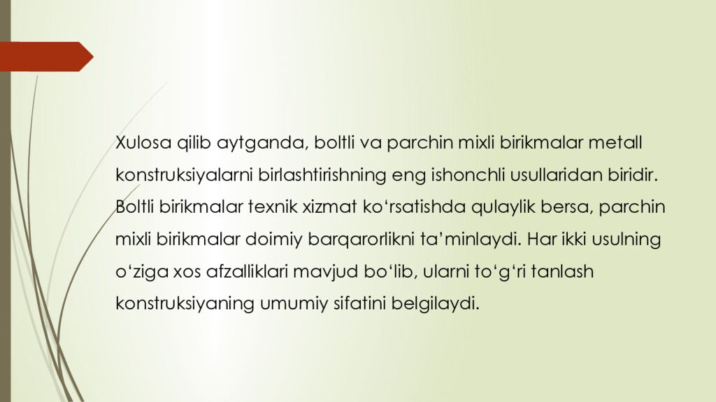 Xulosa qilib aytganda, boltli va parchin mixli birikmalar metall konstruksiyalarni birlashtirishning eng ishonchli usullaridan biridir. Boltli birikmalar texnik xizmat ko‘rsatishda qulaylik bersa, parchin mixli birikmalar doimiy barqarorlikni ta’minlaydi. Har ikki usulning o‘ziga xos afzalliklari mavjud bo‘lib, ularni to‘g‘ri tanlash konstruksiyaning umumiy sifatini belgilaydi.