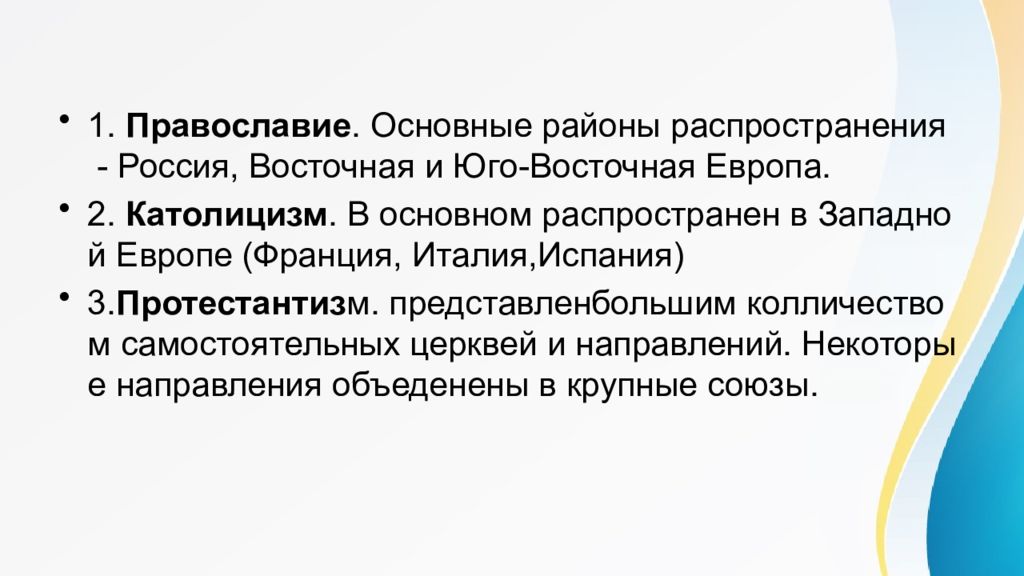1. Православие. Основные районы распространения - Россия, Восточная и Юго-Восточная Европа. 2. Католицизм. В основном распространен в Западной Европе (Франция, Италия,Испания) 3. Протестантиз м. представленбольшим колличеством самостоятельных церквей и направлений. Некоторые направления объеденены в крупные союзы.