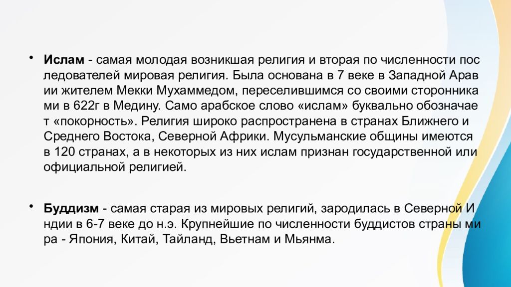 Ислам - самая молодая возникшая религия и вторая по численности последователей мировая религия. Была основана в 7 веке в Западной Аравии жителем Мекки Мухаммедом, переселившимся со своими сторонниками в 622г в Медину. Само арабское слово «ислам» буквально обозначает «покорность». Религия широко распространена в странах Ближнего и Среднего Востока, Северной Африки. Мусульманские общины имеются в 120 странах, а в некоторых из них ислам признан государственной или официальной религией. Буддизм - самая старая из мировых религий, зародилась в Северной Индии в 6-7 веке до н.э. Крупнейшие по численности буддистов страны мира - Япония, Китай, Тайланд, Вьетнам и Мьянма.