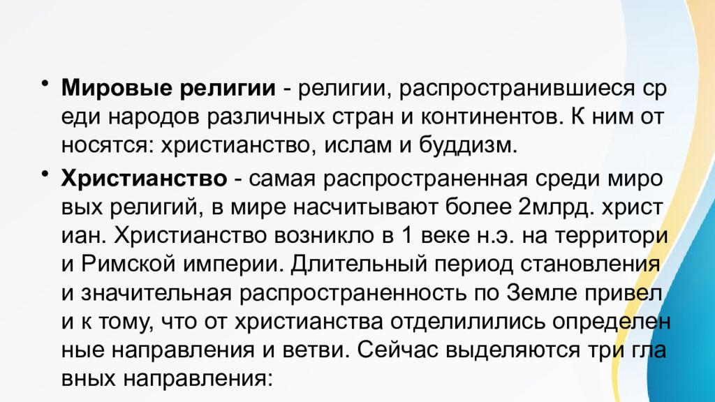 Мировые религии - религии, распространившиеся среди народов различных стран и континентов. К ним относятся : христианство, ислам и буддизм. Христианство - самая распространенная среди мировых религий, в мире насчитывают более 2млрд. христиан. Христианство возникло в 1 веке н.э. на территории Римской империи. Длительный период становления и значительная распространенность по Земле привели к тому, что от христианства отделилились определенные направления и ветви. Сейчас выделяются три главных направления :