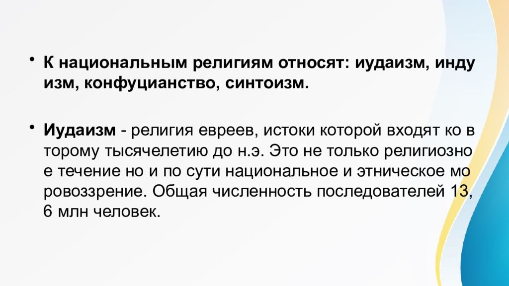 К национальным религиям относят : иудаизм, индуизм, конфуцианство, синтоизм. Иудаизм - религия евреев, истоки которой входят ко второму тысячелетию до н.э. Это не только религиозное течение но и по сути национальное и этническое моровоззрение. Общая численность последователей 13,6 млн человек.