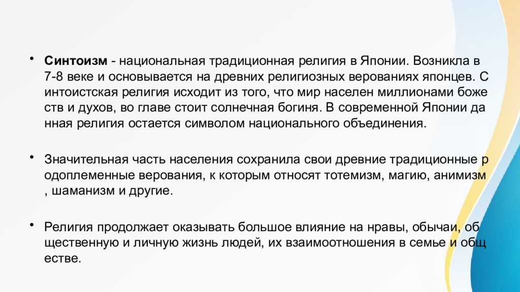 Синтоизм - национальная традиционная религия в Японии. Возникла в 7-8 веке и основывается на древних религиозных верованиях японцев. Синтоистская религия исходит из того, что мир населен миллионами божеств и духов, во главе стоит солнечная богиня. В современной Японии данная религия остается символом национального объединения. Значительная часть населения сохранила свои древние традиционные родоплеменные верования, к которым относят тотемизм, магию, анимизм, шаманизм и другие. Религия продолжает оказывать большое влияние на нравы, обычаи, общественную и личную жизнь людей, их взаимоотношения в семье и обществе.