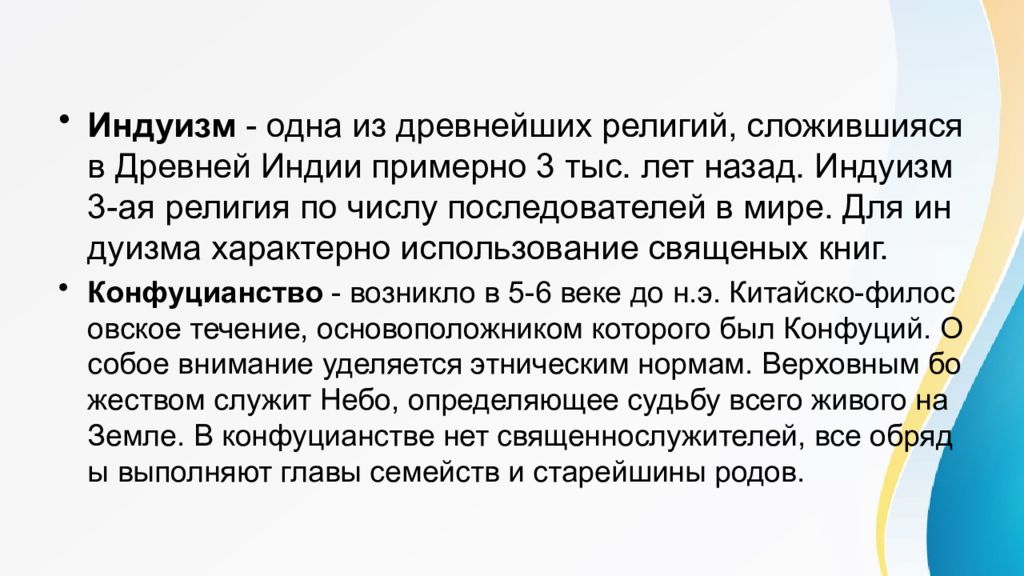 Индуизм - одна из древнейших религий, сложившияся в Древней Индии примерно 3 тыс. лет назад. Индуизм 3-ая религия по числу последователей в мире. Для индуизма характерно использование священых книг. Конфуцианство - возникло в 5-6 веке до н.э. Китайско-филосовское течение, основоположником которого был Конфуций. Особое внимание уделяется этническим нормам. Верховным божеством служит Небо, определяющее судьбу всего живого на Земле. В конфуцианстве нет священнослужителей, все обряды выполняют главы семейств и старейшины родов.
