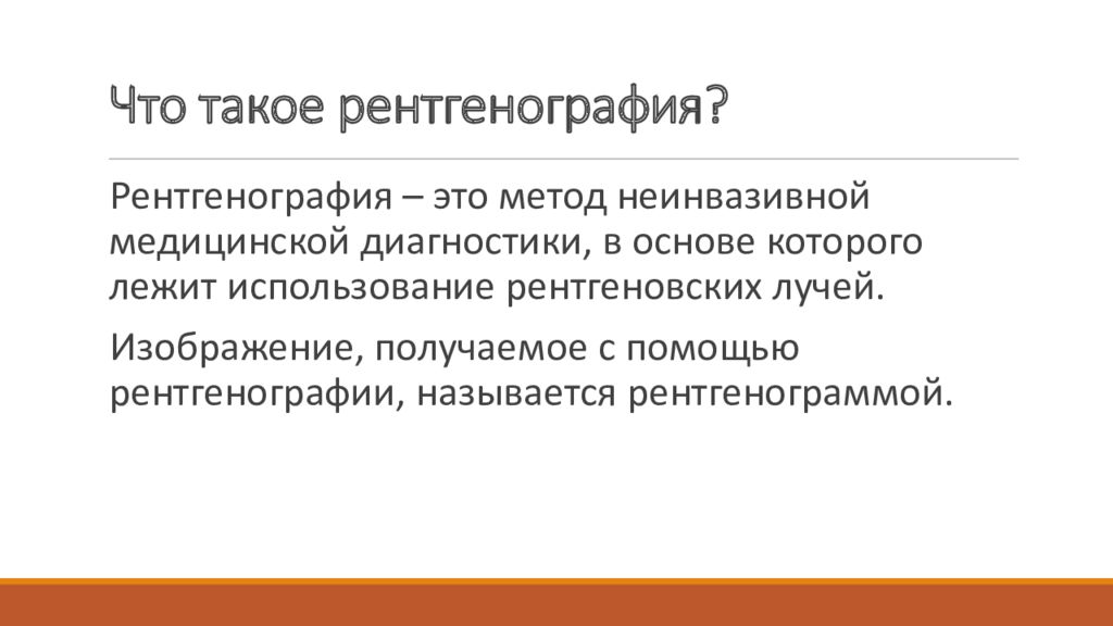 Рентгенография – это метод неинвазивной медицинской диагностики, в основе которого лежит использование рентгеновских лучей. Изображение, получаемое с помощью рентгенографии, называется рентгенограммой.
