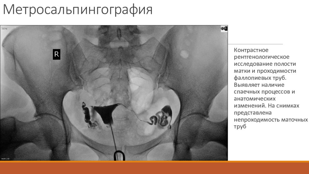 Контрастное рентгенологическое исследование полости матки и проходимости фаллопиевых труб. Выявляет наличие спаечных процессов и анатомических изменений. На снимках представлена непроходимость маточных труб