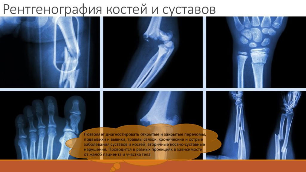 Позволяет диагностировать открытые и закрытые переломы, подвывихи и вывихи, травмы связок, хронические и острые заболевания суставов и костей, вторичные костно-суставные нарушения. Проводится в разных проекциях в зависимости от жалоб пациента и участка тела