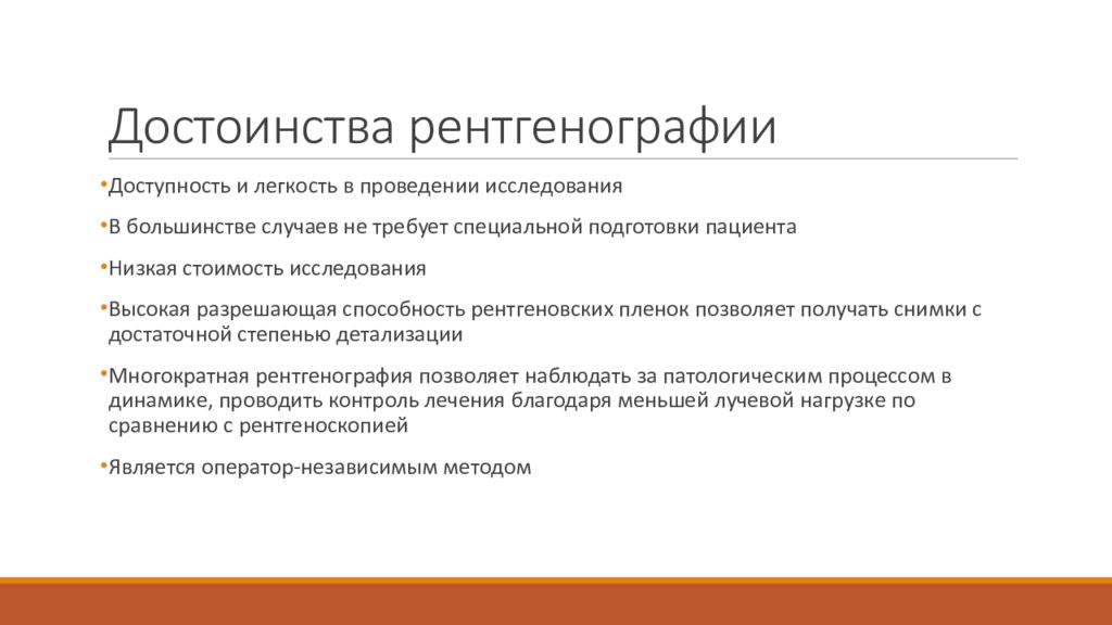 Доступность и легкость в проведении исследования В большинстве случаев не требует специальной подготовки пациента Низкая стоимость исследования Высокая разрешающая способность рентгеновских пленок позволяет получать снимки с достаточной степенью детализации Многократная рентгенография позволяет наблюдать за патологическим процессом в динамике, проводить контроль лечения благодаря меньшей лучевой нагрузке по сравнению с рентгеноскопией Является оператор-независимым методом