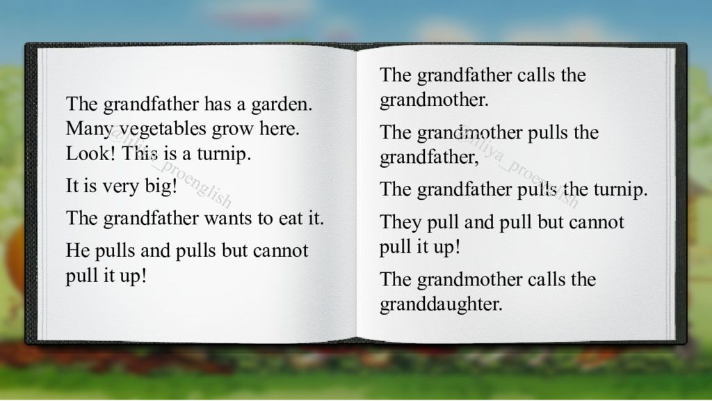 The grandfather has a garden. Many vegetables grow here. Look! This is a turnip. It is very big! The grandfather wants to eat it. He pulls and pulls but cannot pull it up ! The grandfather calls the grandmother. The grandmother pulls the grandfather, The grandfather pulls the turnip. They pull and pull but cannot pull it up! The grandmother calls the granddaughter.