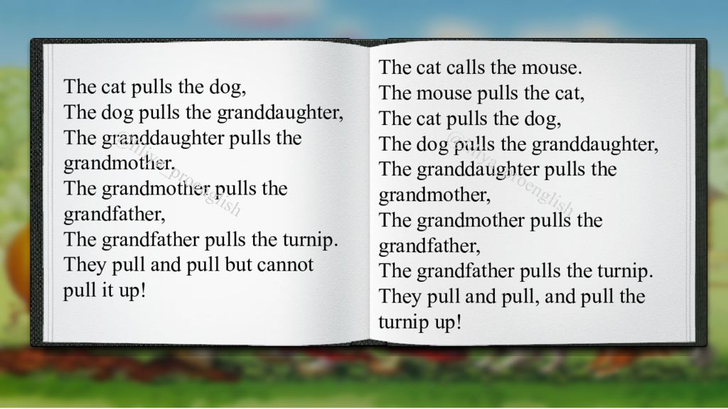 The cat pulls the dog, The dog pulls the granddaughter, The granddaughter pulls the grandmother, The grandmother pulls the grandfather, The grandfather pulls the turnip. They pull and pull but cannot pull it up ! The cat calls the mouse. The mouse pulls the cat, The cat pulls the dog, The dog pulls the granddaughter, The granddaughter pulls the grandmother, The grandmother pulls the grandfather, The grandfather pulls the turnip. They pull and pull, and pull the turnip up !
