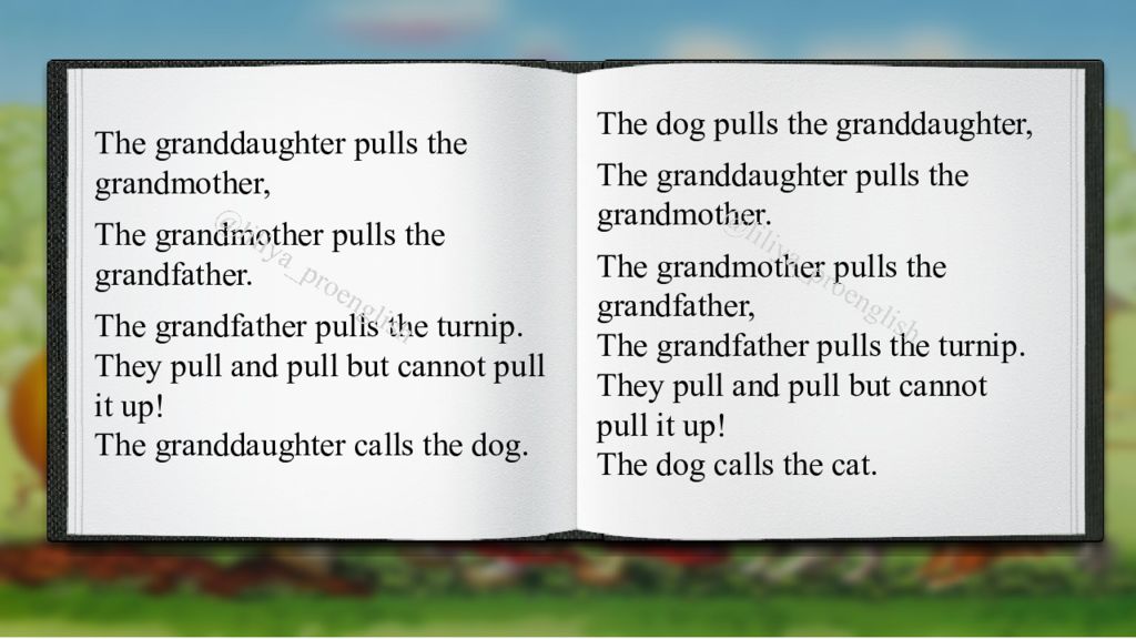 The granddaughter pulls the grandmother, The grandmother pulls the grandfather. The grandfather pulls the turnip. They pull and pull but cannot pull it up! The granddaughter calls the dog. The dog pulls the granddaughter, The granddaughter pulls the grandmother. The grandmother pulls the grandfather, The grandfather pulls the turnip. They pull and pull but cannot pull it up! The dog calls the cat.