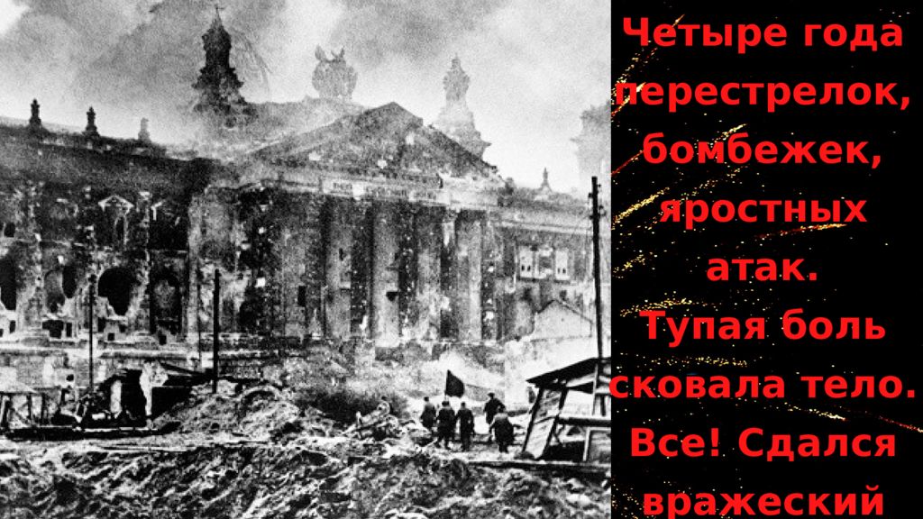 Четыре года перестрелок, б омбежек, яростных атак. Тупая боль сковала тело. Все ! Сдался вражеский Рейхстаг !