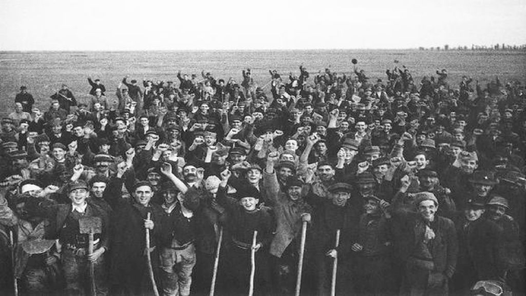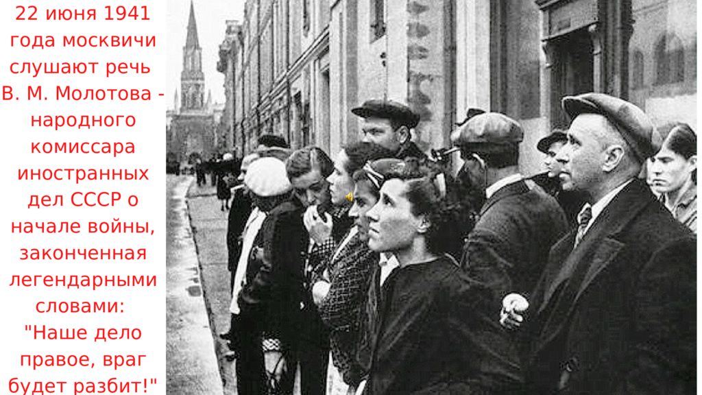 22 июня 1941 года москвичи слушают речь В. М. Молотова - народного комиссара иностранных дел СССР о начале войны, законченная легендарными словами : " Наше дело правое, враг будет разбит !"