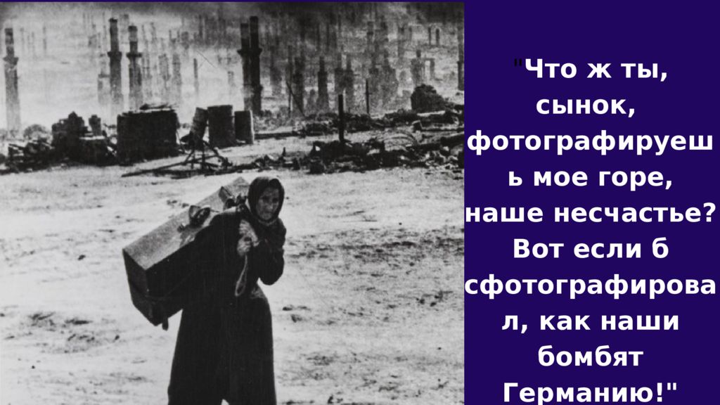 " Что ж ты, сынок, фотографируешь мое горе, наше несчастье ? Вот если б сфотографировал, как наши бомбят Германию !"