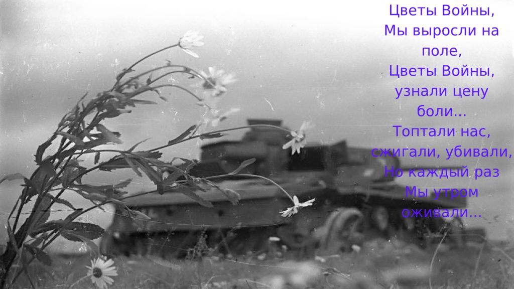 Цветы Войны, Мы выросли на поле, Цветы Войны, узнали цену боли... Топтали нас, сжигали, убивали, Но каждый раз Мы утром оживали...