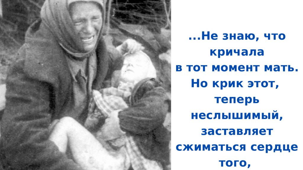 ...Не знаю, что кричала в тот момент мать. Но крик этот, теперь неслышимый, заставляет сжиматься сердце того, кто посмотрит на фотографию.