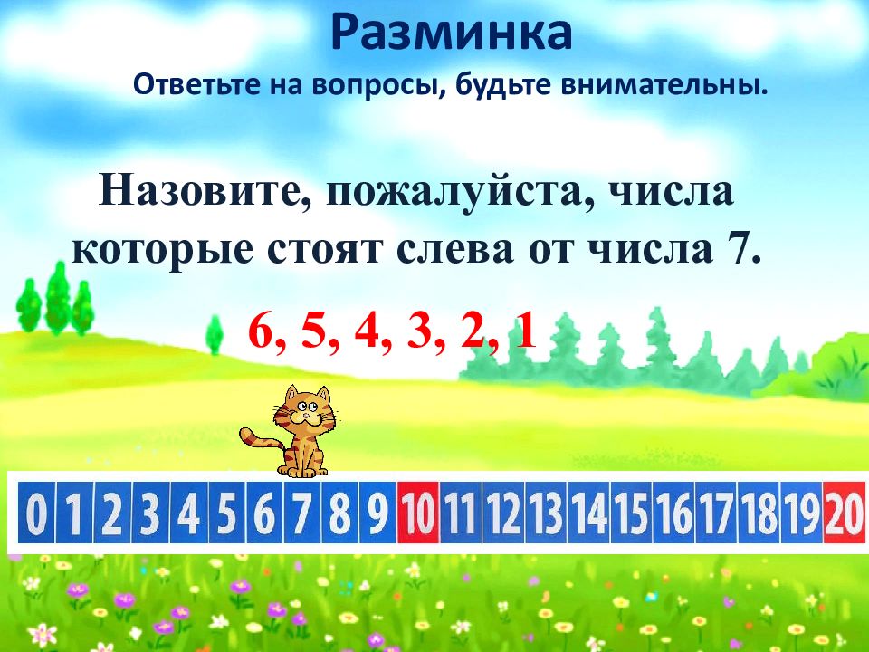 Разминка Ответьте на вопросы, будьте внимательны. Назовите, пожалуйста, числа которые стоят слева от числа 7. 6, 5, 4, 3, 2, 1