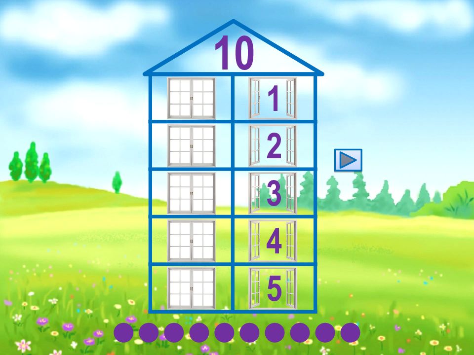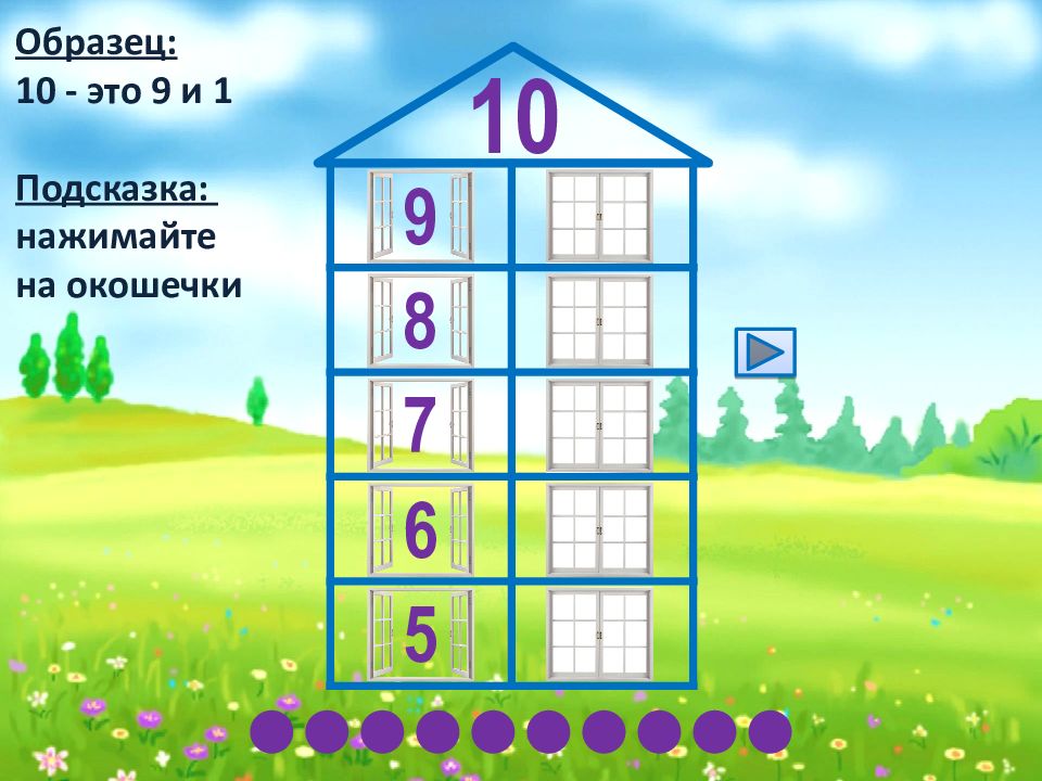 9 1 8 2 7 3 6 4 5 5 10 Образец: 10 - это 9 и 1 Подсказка: нажимайте на окошечки