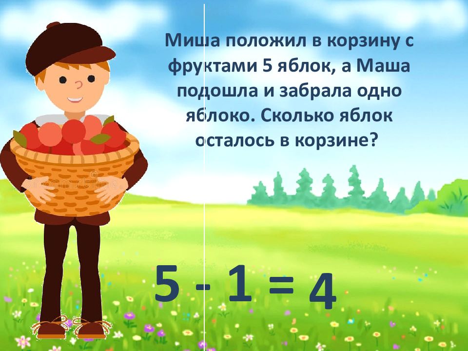 Миша положил в корзину с фруктами 5 яблок, а Маша подошла и забрала одно яблоко. Сколько яблок осталось в корзине ? 5 - 1 = 4