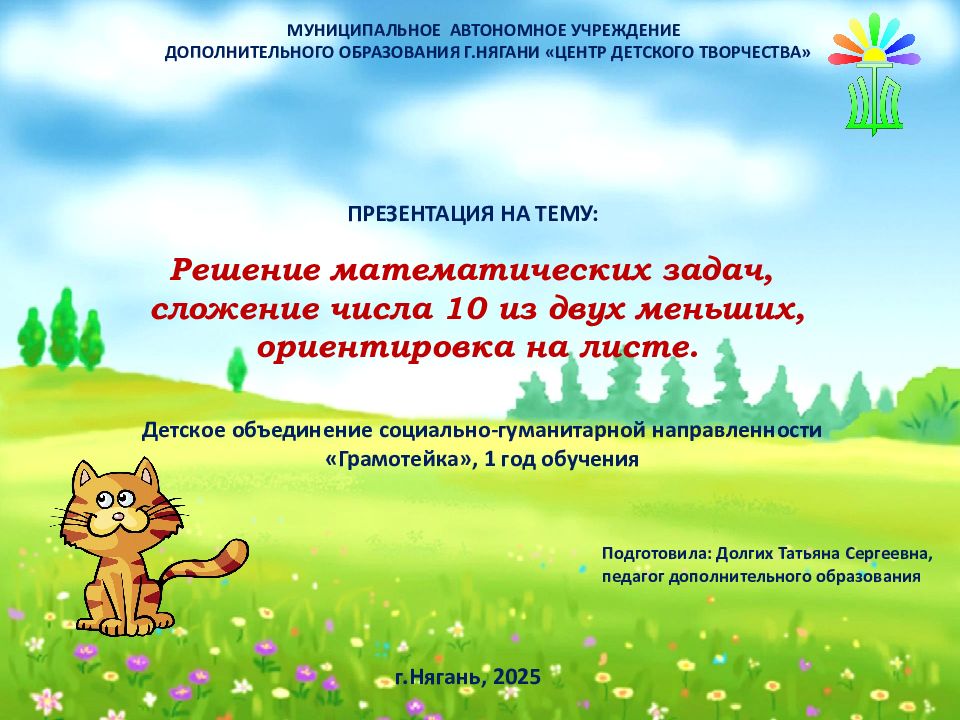 МУНИЦИПАЛЬНОЕ АВТОНОМНОЕ УЧРЕЖДЕНИЕ ДОПОЛНИТЕЛЬНОГО ОБРАЗОВАНИЯ Г.НЯГАНИ «ЦЕНТР ДЕТСКОГО ТВОРЧЕСТВА» ПРЕЗЕНТАЦИЯ НА ТЕМУ: Подготовила: Долгих Татьяна Сергеевна, педагог дополнительного образования г.Нягань, 2025 Детское объединение социально-гуманитарной направленности «Грамотейка», 1 год обучения