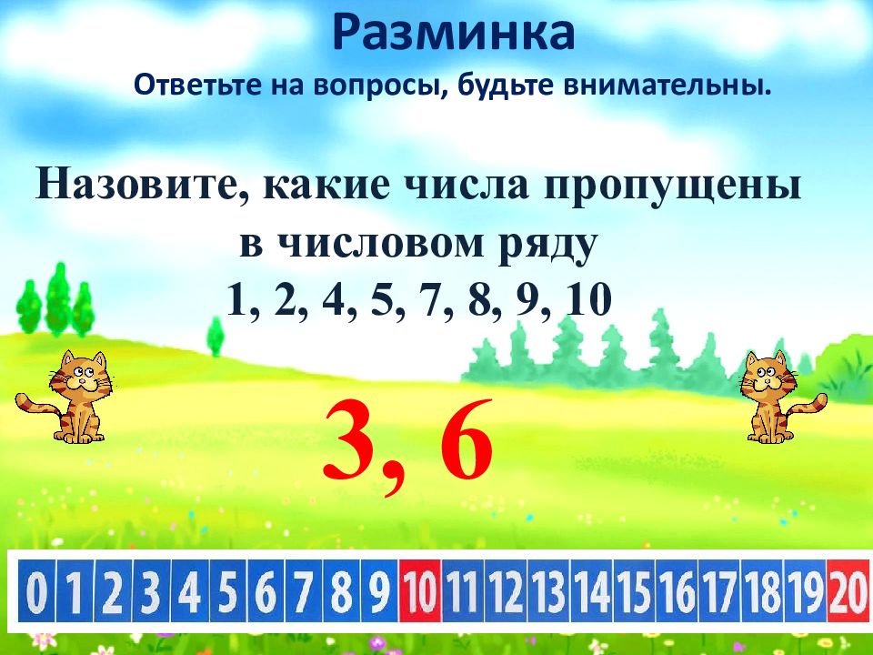 Разминка Ответьте на вопросы, будьте внимательны. Назовите, какие числа пропущены в числовом ряду 1, 2, 4, 5, 7, 8, 9, 10 3, 6