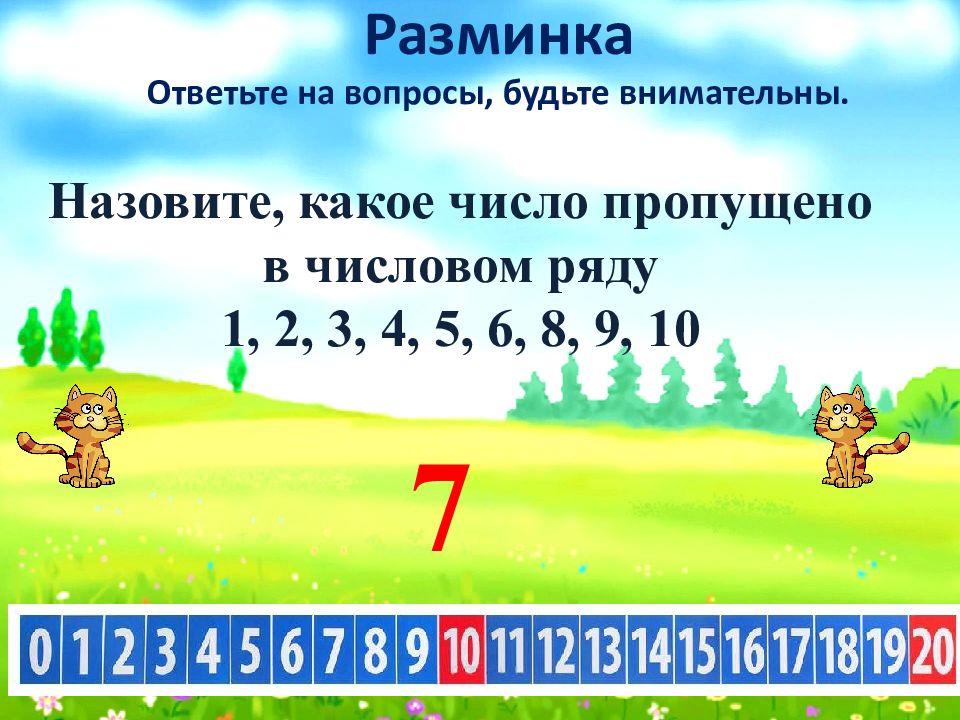 Разминка Ответьте на вопросы, будьте внимательны. Назовите, какое число пропущено в числовом ряду 1, 2, 3, 4, 5, 6, 8, 9, 10 7