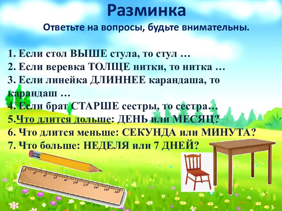 Разминка Ответьте на вопросы, будьте внимательны. 1. Если стол ВЫШЕ стула, то стул … 2. Если веревка ТОЛЩЕ нитки, то нитка … 3. Если линейка ДЛИННЕЕ карандаша, то карандаш … 4. Если брат СТАРШЕ сестры, то сестра… 5. Что длится дольше : ДЕНЬ или МЕСЯЦ? 6. Что длится меньше: СЕКУНДА или МИНУТА? 7. Что больше: НЕДЕЛЯ или 7 ДНЕЙ?