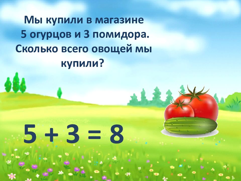Мы купили в магазине 5 огурцов и 3 помидора. Сколько всего овощей мы купили ? 5 + 3 = 8
