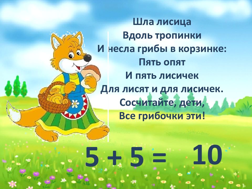 Шла лисица Вдоль тропинки И несла грибы в корзинке : Пять опят И пять лисичек Для лисят и для лисичек. Сосчитайте, дети, Все грибочки эти ! 5 + 5 = 10