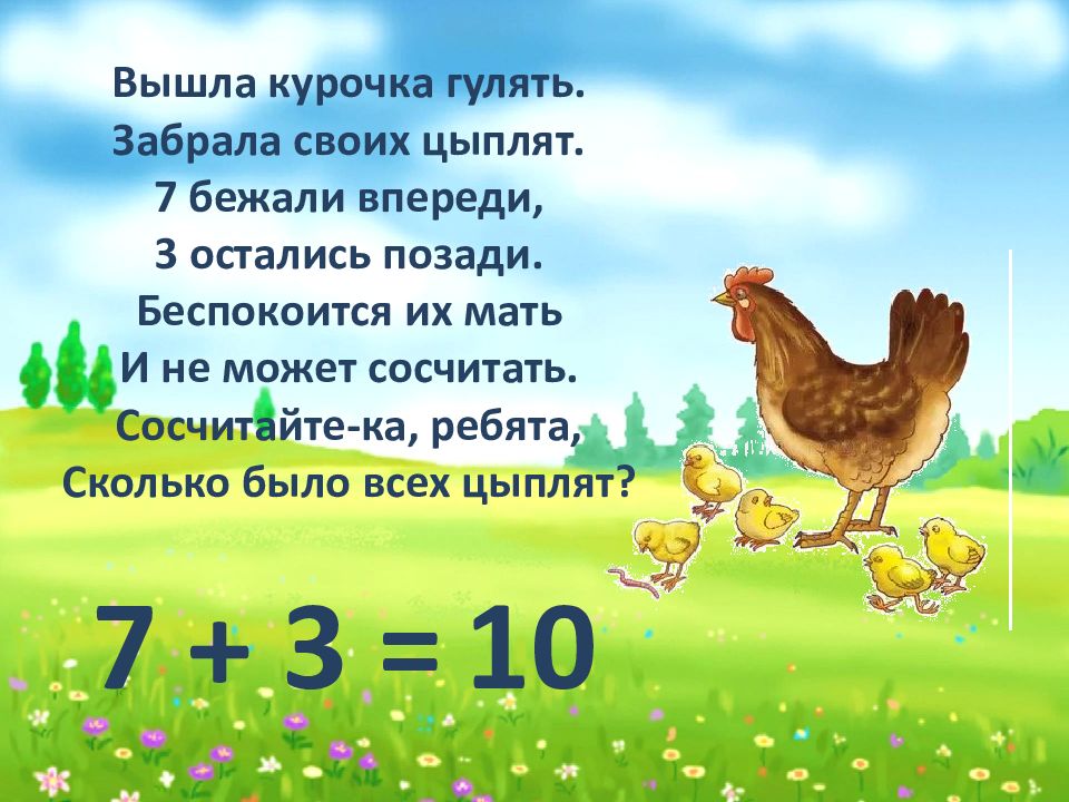 Вышла курочка гулять. Забрала своих цыплят. 7 бежали впереди, 3 остались позади. Беспокоится их мать И не может сосчитать. Сосчитайте - ка, ребята, Сколько было всех цыплят ? 7 + 3 = 10
