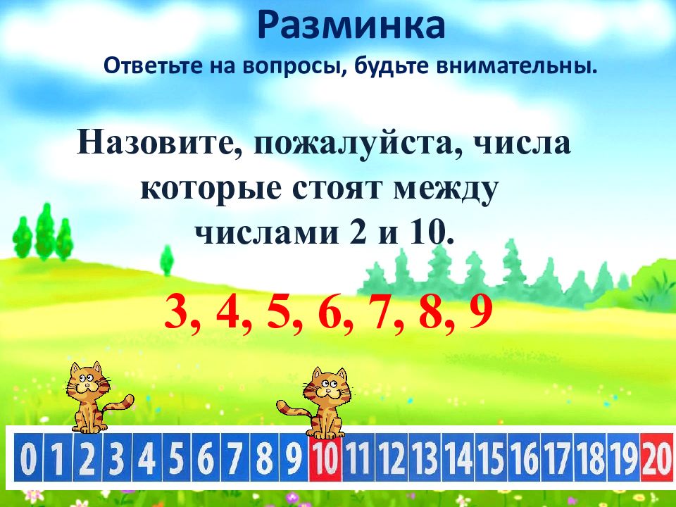 Разминка Ответьте на вопросы, будьте внимательны. Назовите, пожалуйста, числа которые стоят между числами 2 и 10. 3, 4, 5, 6, 7, 8, 9