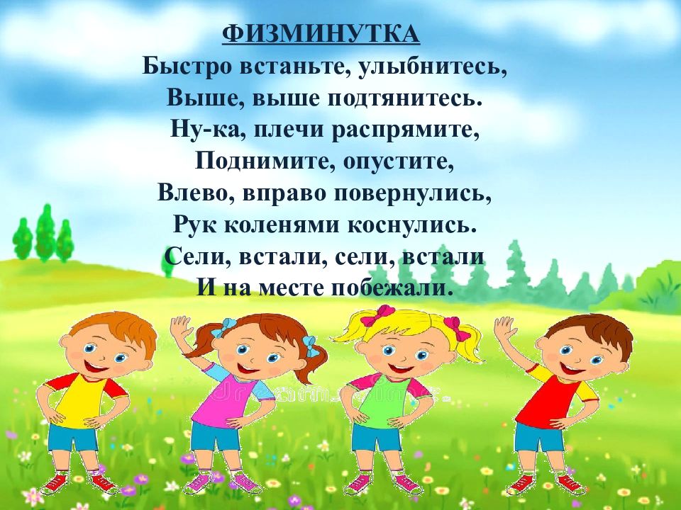 ФИЗМИНУТКА Быстро встаньте, улыбнитесь, Выше, выше подтянитесь. Ну-ка, плечи распрямите, Поднимите, опустите, Влево, вправо повернулись, Рук коленями коснулись. Сели, встали, сели, встали И на месте побежали.