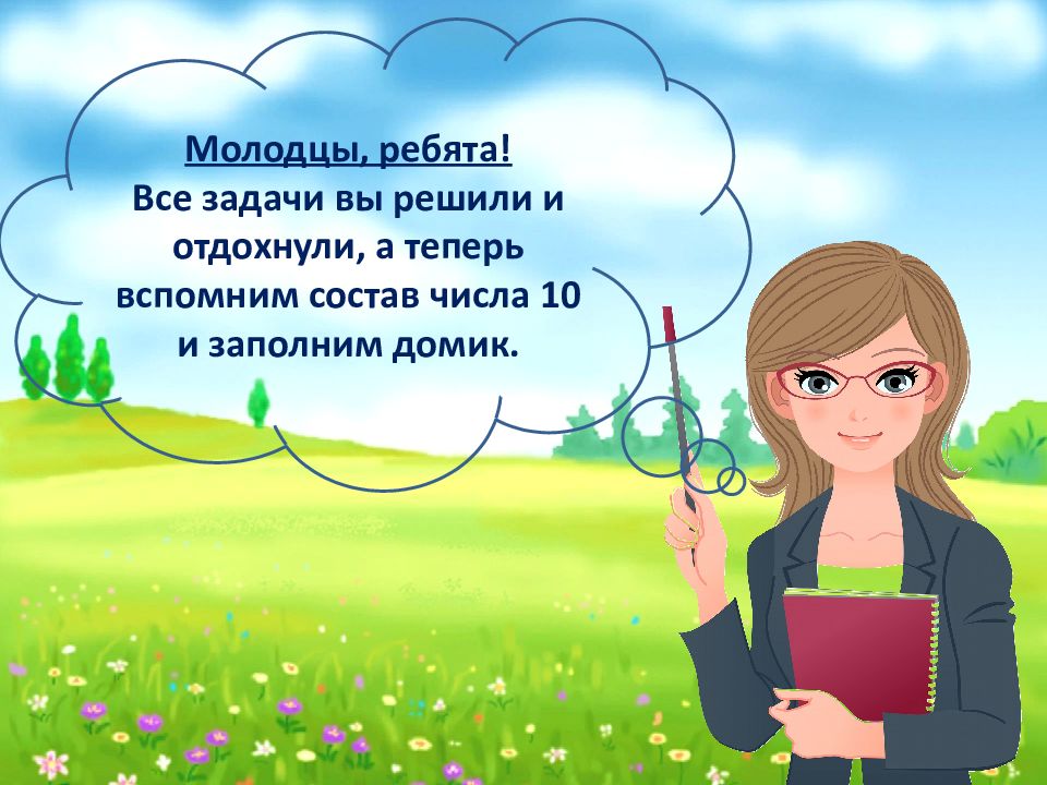 Молодцы, ребята! Все задачи вы решили и отдохнули, а теперь вспомним состав числа 10 и заполним домик.