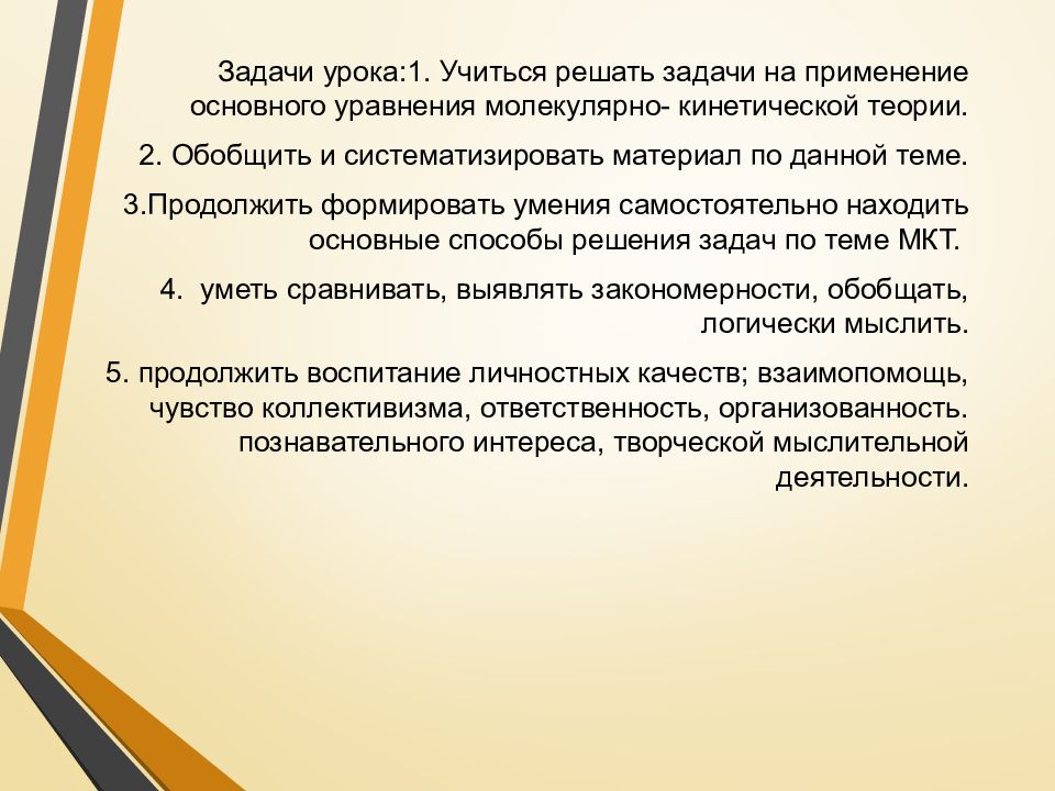 Задачи урока:1. Учиться решать задачи на применение основного уравнения молекулярно- кинетической теории. 2. Обобщить и систематизировать материал по данной теме. 3.Продолжить формировать умения самостоятельно находить основные способы решения задач по теме МКТ. 4. уметь сравнивать, выявлять закономерности, обобщать, логически мыслить. 5. продолжить воспитание личностных качеств; взаимопомощь, чувство коллективизма, ответственность, организованность. познавательного интереса, творческой мыслительной деятельности.