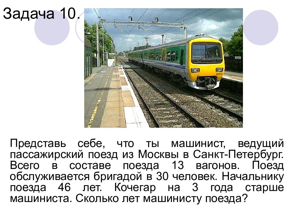 Представь себе, что ты машинист, ведущий пассажирский поезд из Москвы в Санкт-Петербург. Всего в составе поезда 13 вагонов. Поезд обслуживается бригадой в 30 человек. Начальнику поезда 46 лет. Кочегар на 3 года старше машиниста. Сколько лет машинисту поезда? Задача 10.