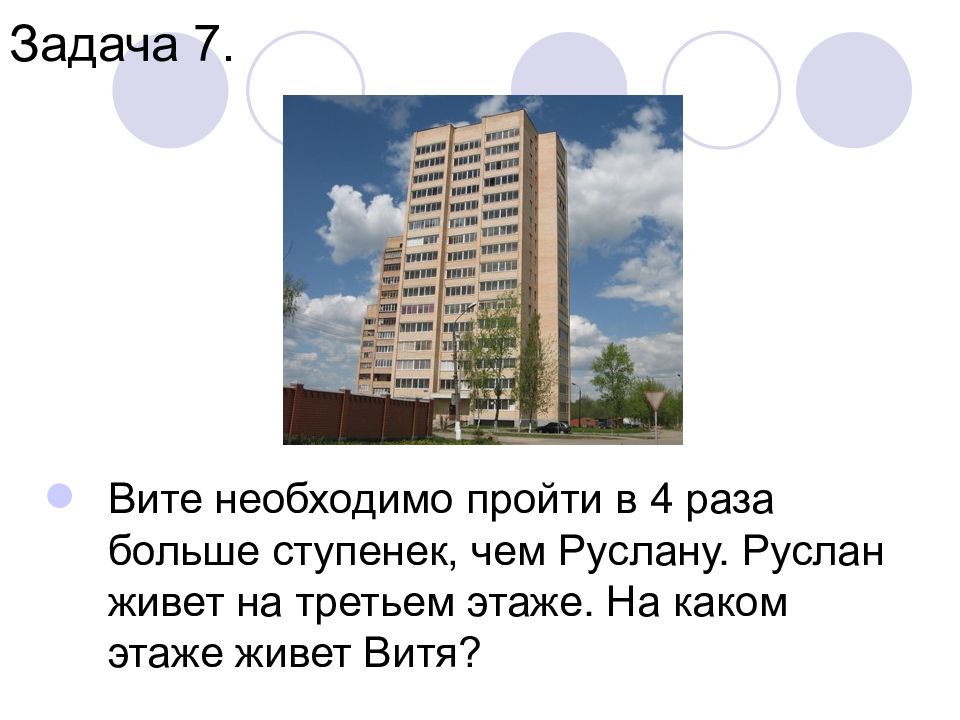 Вите необходимо пройти в 4 раза больше ступенек, чем Руслану. Руслан живет на третьем этаже. На каком этаже живет Витя? Задача 7.