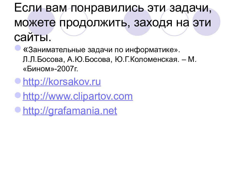 Последний слайд презентации: Решение занимательных задач по информатике: Если вам понравились эти задачи, можете продолжить, заходя на эти сайты