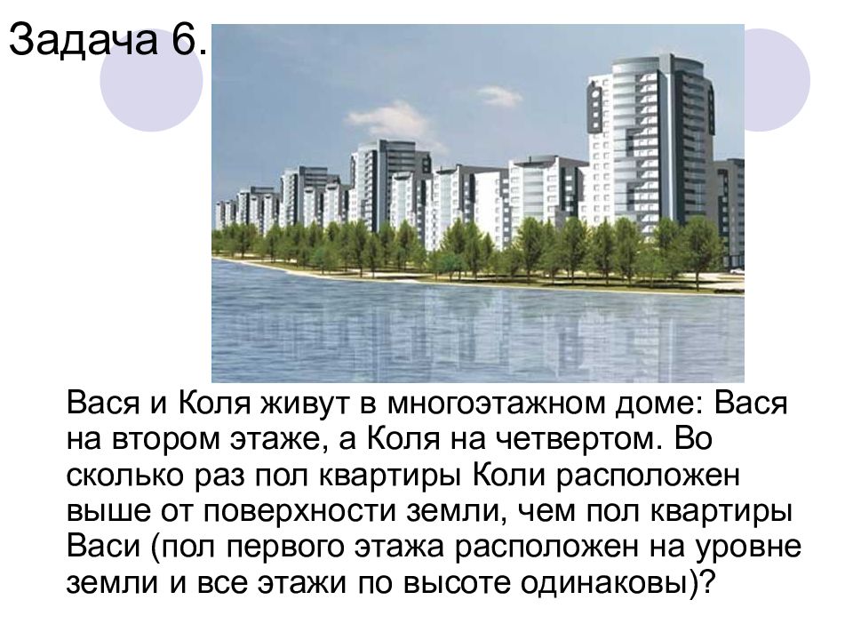 Вася и Коля живут в многоэтажном доме: Вася на втором этаже, а Коля на четвертом. Во сколько раз пол квартиры Коли расположен выше от поверхности земли, чем пол квартиры Васи (пол первого этажа расположен на уровне земли и все этажи по высоте одинаковы)? Задача 6.