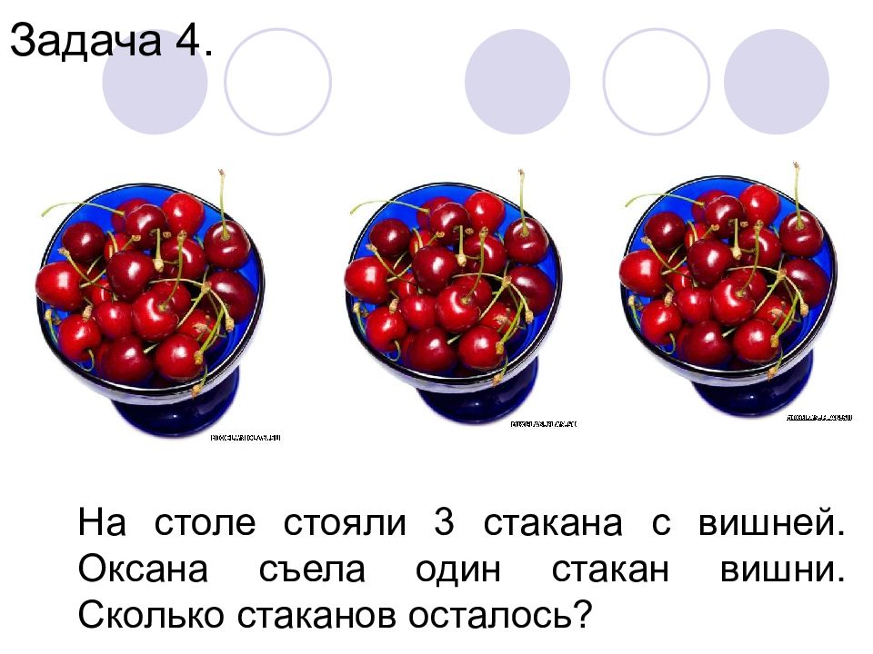 На столе стояли 3 стакана с вишней. Оксана съела один стакан вишни. Сколько стаканов осталось?